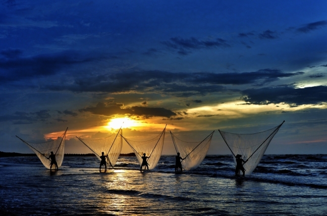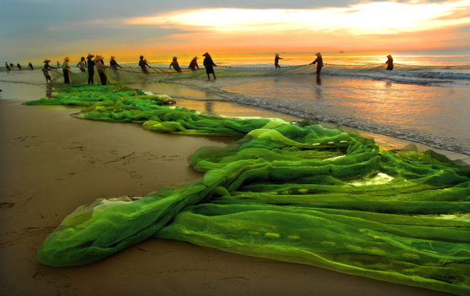 Ngư dân thả và kéo lưới tại bờ biển Sầm Sơn, Thanh Hóa.