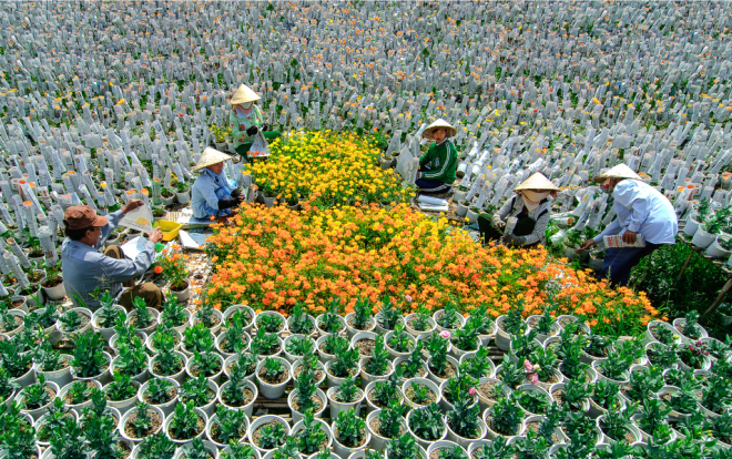 Hoa xuân đang được gói giấy để chuẩn bị đem ra chợ.