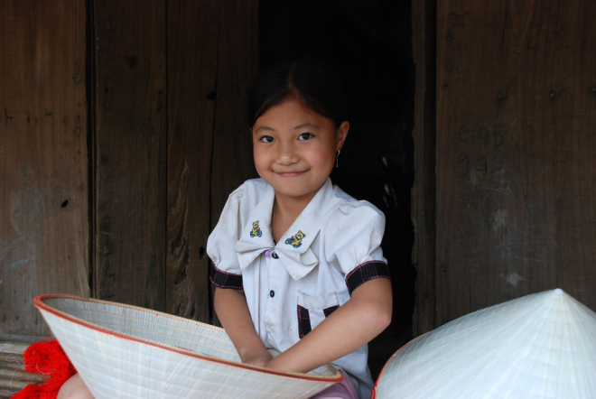 Một em bé đang giúp mẹ khâu nón. Em có đôi tay thành thục và một đôi mắt rất sáng trong. Dù nhỏ tuổi nhưng dường như em đã mang hình ảnh của những người phụ nữ đảm đang, tháo vát và chịu khó.