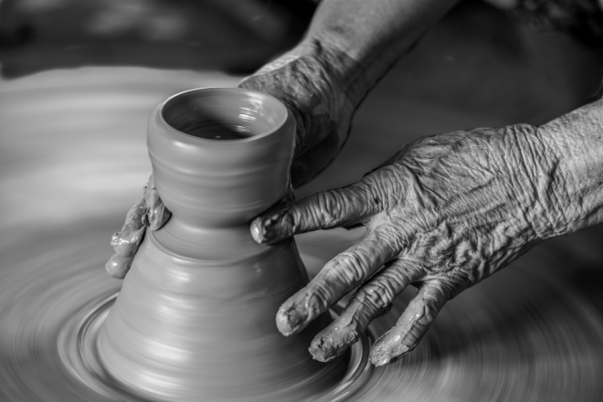 Đôi bàn tay của cụ bà làng gốm Thanh Hà – Hội An. Cụ làm gốm từ hồi còn rất nhỏ, nay cụ đã 78 tuổi nhưng vẫn điêu luyện thể hiện khi có khách viếng thăm.